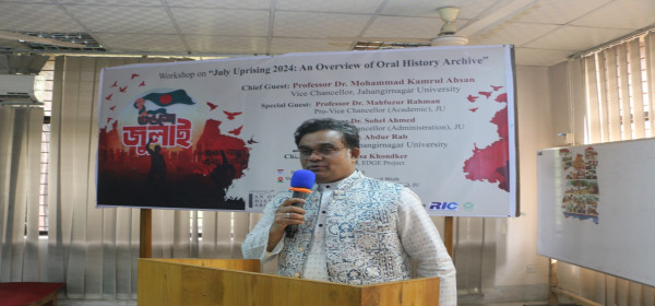 জাহাঙ্গীরনগর বিশ্ববিদ্যালয়ে `July Uprising 2024: An Overview of Oral History Archive’ শীর্ষক কর্মশালা আজ সকাল এগারোটায় বিশ্ববিদ্যালয়ের ওয়াজেদ মিয়া বিজ্ঞান গবেষণা কেন্দ্রের সেমিনার কক্ষে অনুষ্ঠিত হয়েছে। কর্মশালায় প্রধান অতিথি হিসেবে উপস্থিত ছিলেন উপাচার্য অধ্যাপক ড. মোহাম্মদ কামরুল আহসান।