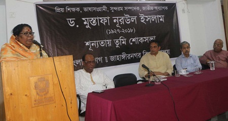জাহাঙ্গীরনগর বিশ্ববিদ্যালয়ের বাংলা বিভাগের আয়োজনে আজ সকাল ১০ টায় জাতীয় অধ্যাপক ড. মুস্তাফা নূরউল ইসলামের স্মরণ সভা অনুষ্ঠিত হয়েছে। বাংলা বিভাগের সেমিনার কক্ষে অনুষ্ঠিত শোক সভায় উপাচার্য অধ্যাপক ড. ফারজানা ইসলাম বলেন, জাহাঙ্গীরনগর বিশ্ববিদ্যালয় অধ্যাপক মুস্তাফা নূরউল ইসলামের মতো দেশ-বরেণ্য শিক্ষকদের আশ্রয়ে বর্ধিষ্ণু হয়েছে। তাঁর প্রয়াণের মধ্যদিয়ে দেশ-জাতি, সর্বোপরি এ বিশ্ববিদ্যালয়ের অপূরণীয় ক্ষতি হয়েছে। উপাচার্য বলেন, অধ্যাপক মুস্তাফা নূরউল ইসলাম তাঁর লেখা এবং সৃষ্টি কর্মের মধ্যদিয়ে বার বার ফিরে আসবেন। উপাচার্য বাংলা বিভাগের পক্ষ থেকে অধ্যাপক মুস্তাফা নূরউল ইসলাম স্মারক গ্রন্থ প্রকাশের আহবান জানান। প্রো-উপাচার্য অধ্যাপক ড. মো. আমির হোসেন তাঁর বক্তব্যে বলেন, অধ্যাপক মুস্তাফা নূরউল ইসলাম জাহাঙ্গীরনগর বিশ্ববিদ্যালয়ের জন্য গর্ব ও সম্মানের ছিলেন। এ বিশ্ববিদ্যালয় তাঁর পরিচয়ে ঋদ্ধ হয়েছে। বাংলা বিভাগের প্রাক্তন শিক্ষক অধ্যাপক আ ফ ম দানীউল হক বলেন, অধ্যাপক মুস্তাফা নূরউল ইসলাম বাংলাদেশের ইতিহাসের অংশ। তিনি জাহাঙ্গীরনগর বিশ্ববিদ্যালয়ের ইতিহাসের নির্মাতা। অধ্যাপক আ খ ম আশরাফউদ্দিন বলেন, অধ্যাপক মুস্তাফা নূরউল ইসলাম
